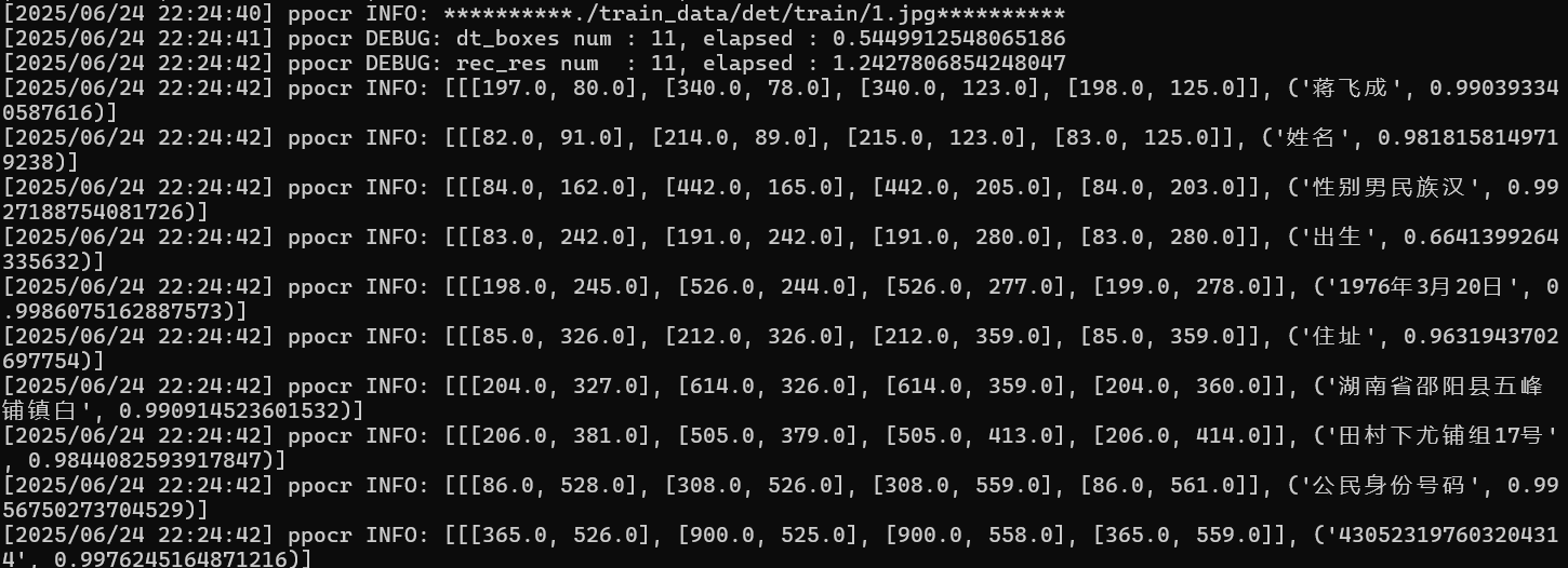 之后可以看到此时识别打印的日志,是位置数组 + 识别内容,表示本地的paddlepaddle + paddleocr已经安装成功